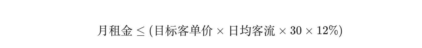 示例: 目标客单价 30 元,预计日均客流 100 人,则月营业额 90,000 元。月租金的临界点在 10,800 元以内。如果租金高于此,回本周期将非常长。